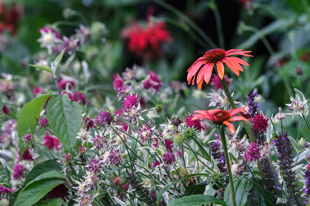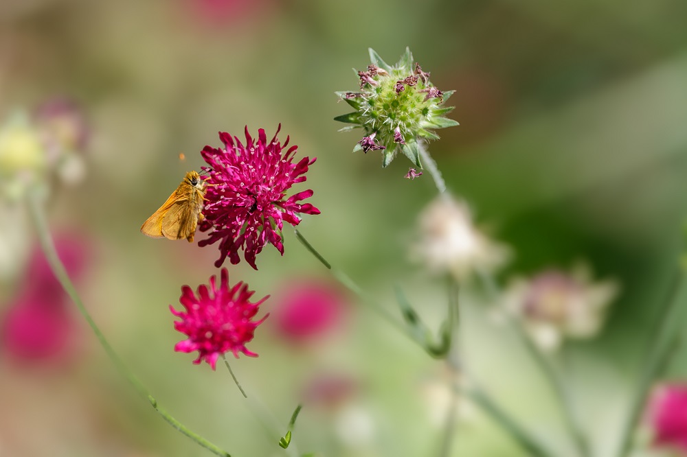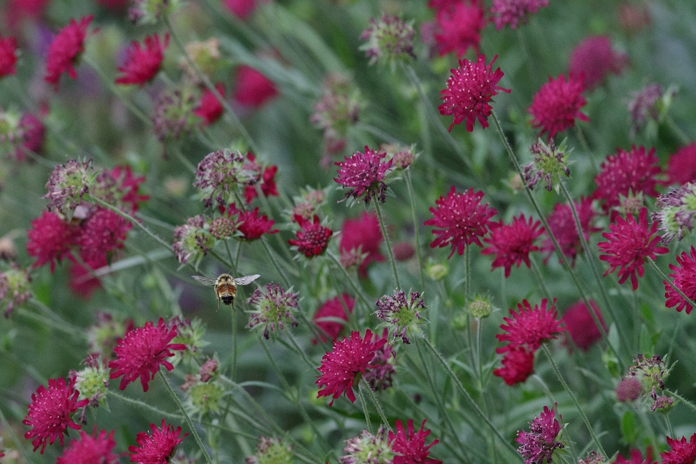 A bee flying over the knautia – one of many that are busy on the front garden plants during the day.