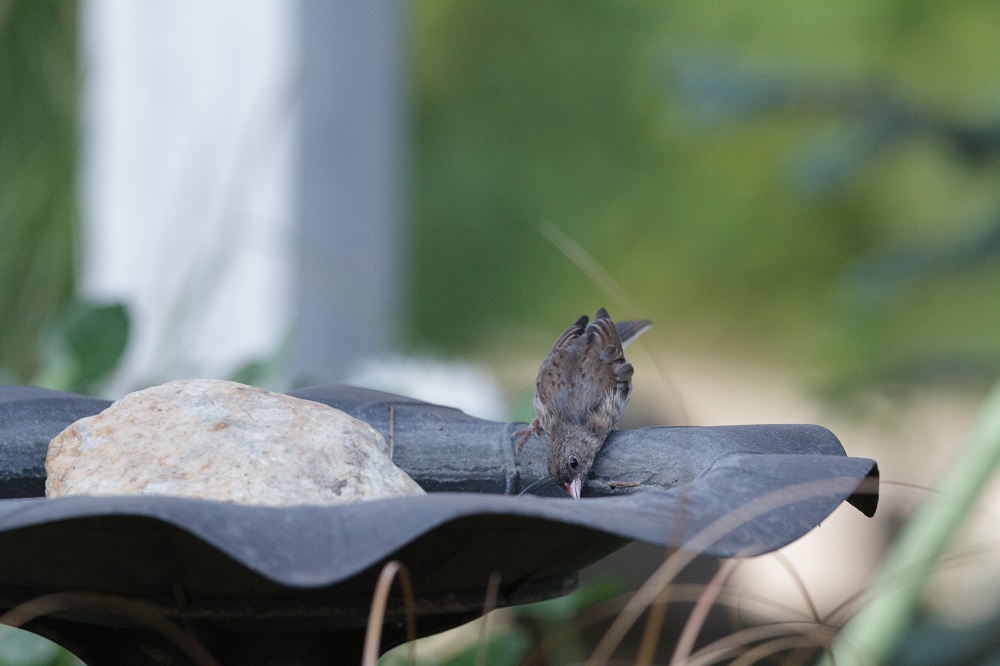 Bird checking out the birdbath. Since this picture we took out the large rock and put in a few smaller ones plus some branches to perch on.