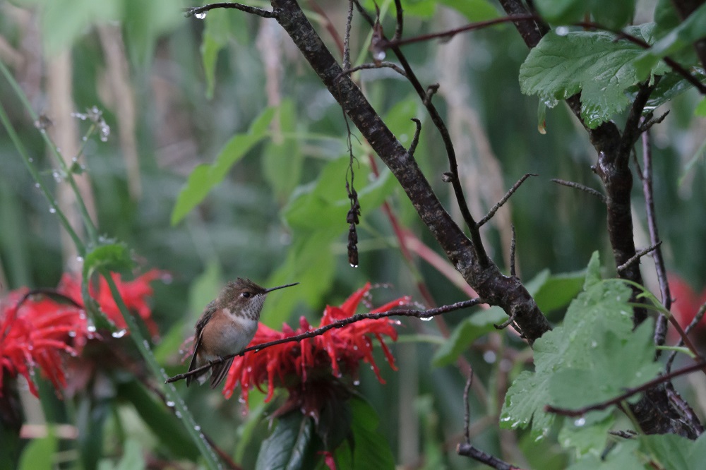 A hummingbird taking a brief rest on the flowering currant after the garden was watered.